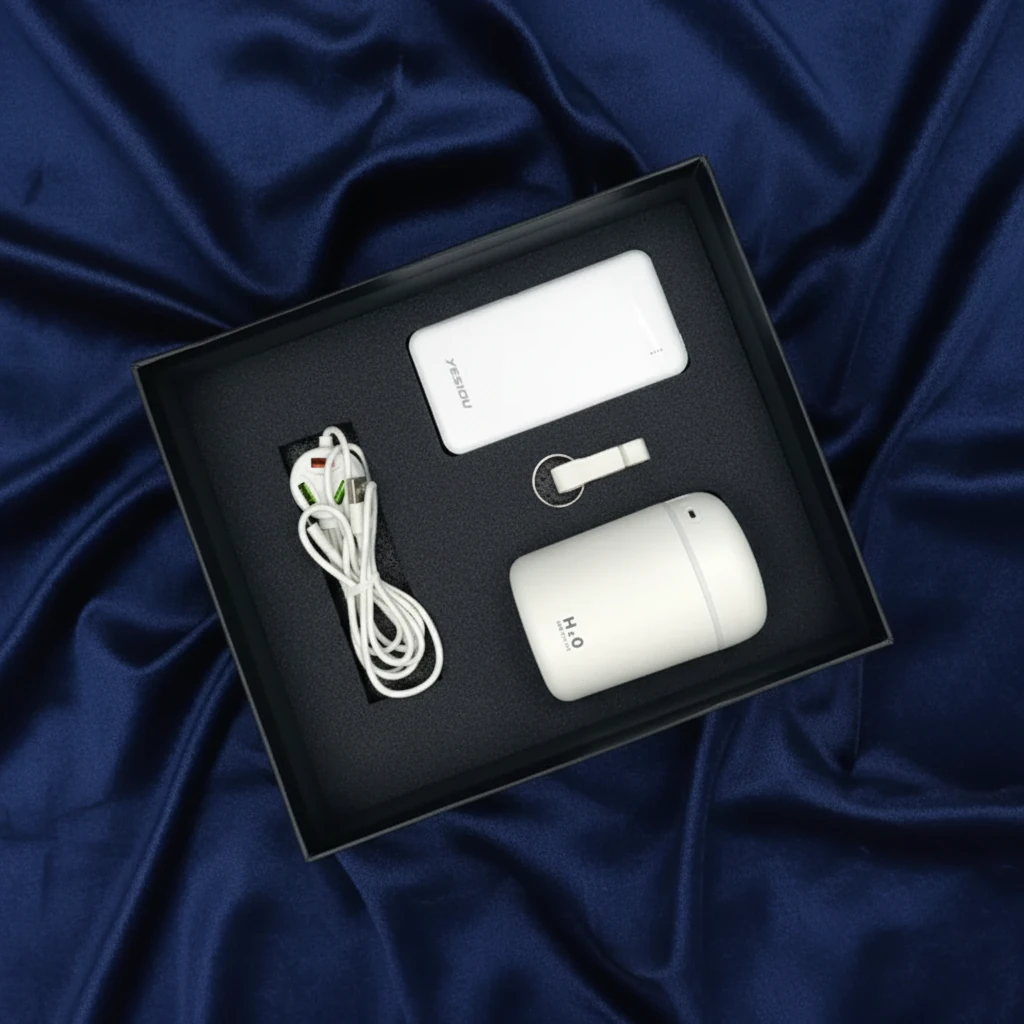 جزییات : هاردباکس _ بخور سرد پاوربانک 8000 _ کابل 3 کاره شارژ _ فلش چرم و فلز