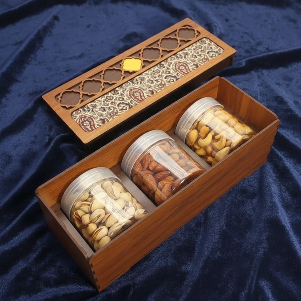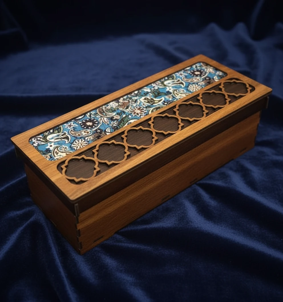 جنس جعبه : جنس ام‌دی‌اف با درب دولایه و پارچه ترمه