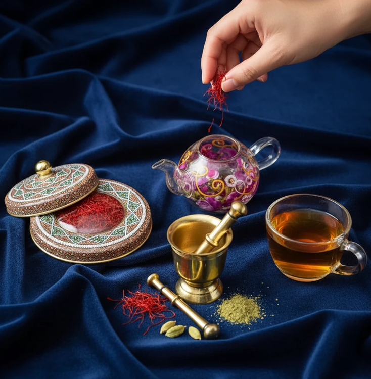 جزییات: یک ظرف خاتم فلزی 5 گرم قوری شیشه ای (محصول بدون زعفران و گل محمدی می باشد برای پک کامل تماس حاصل فرمایید )