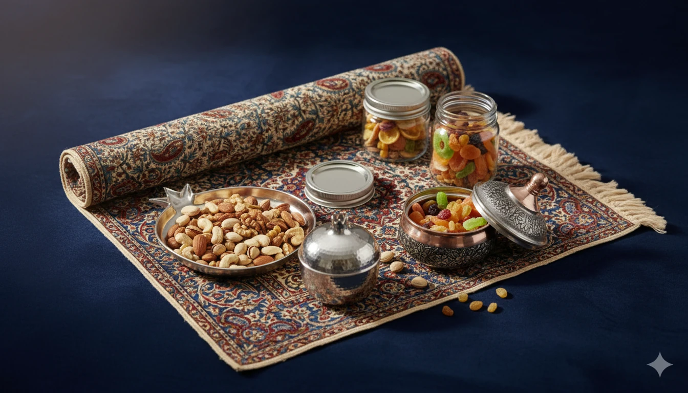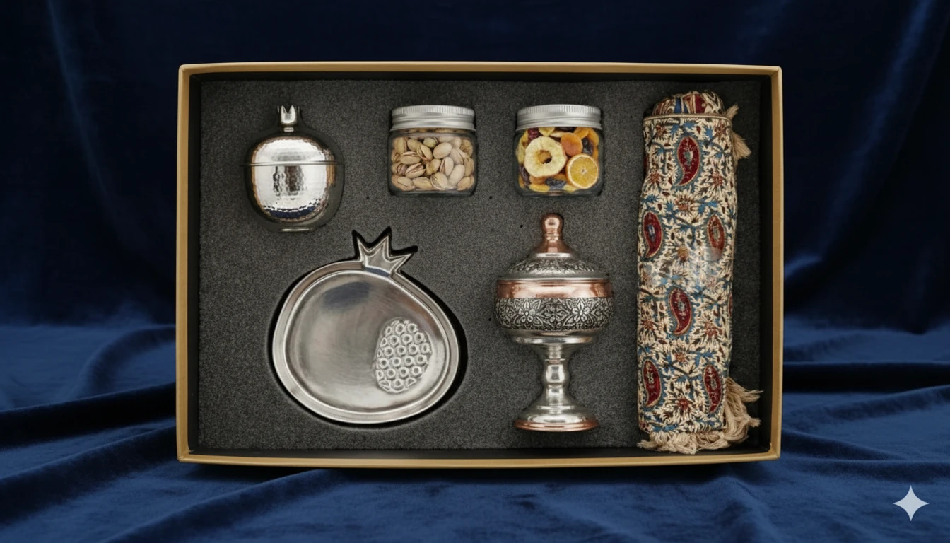 جزییات : آجیل خوری. سفره قلمکار . سینی مسی کروم . قندان مسی کروم .جار پسته و جار میوه خشک