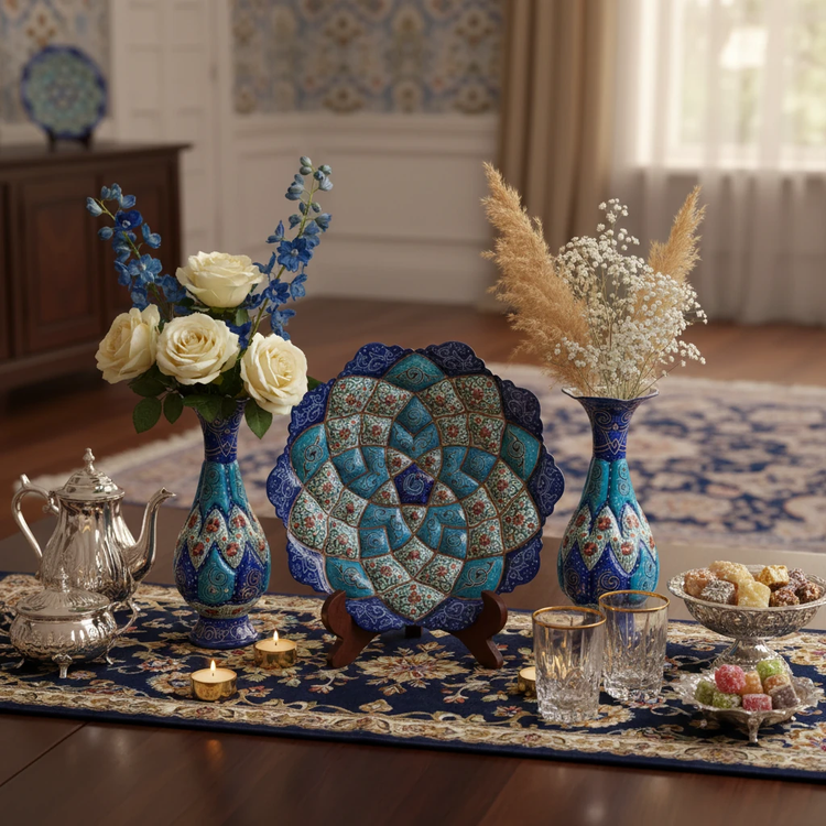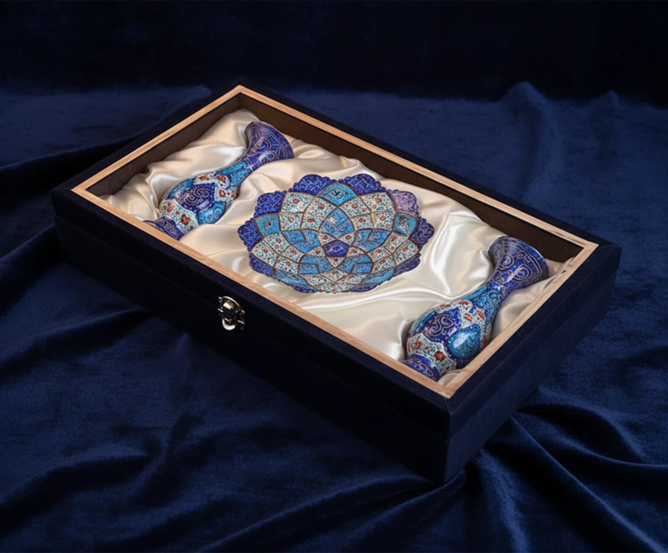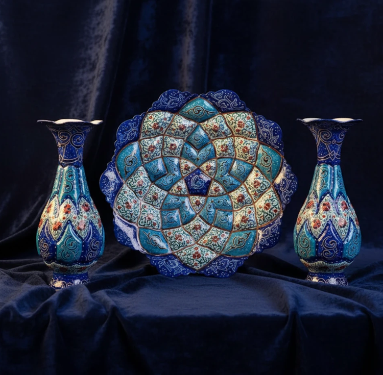 جفت گلدان و بشقاب مس و مینا
