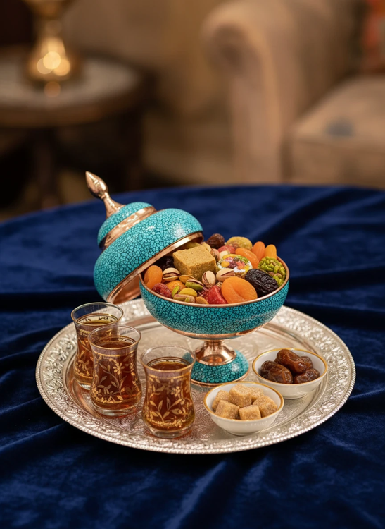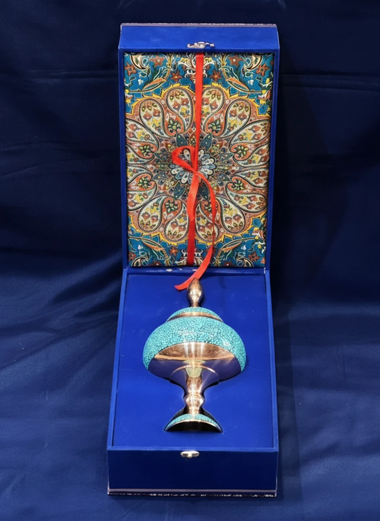 جزئیات: باکس هدیه لوکس مخمل _ شکلات خوری مس و فیروزه _ ترمه