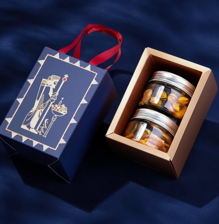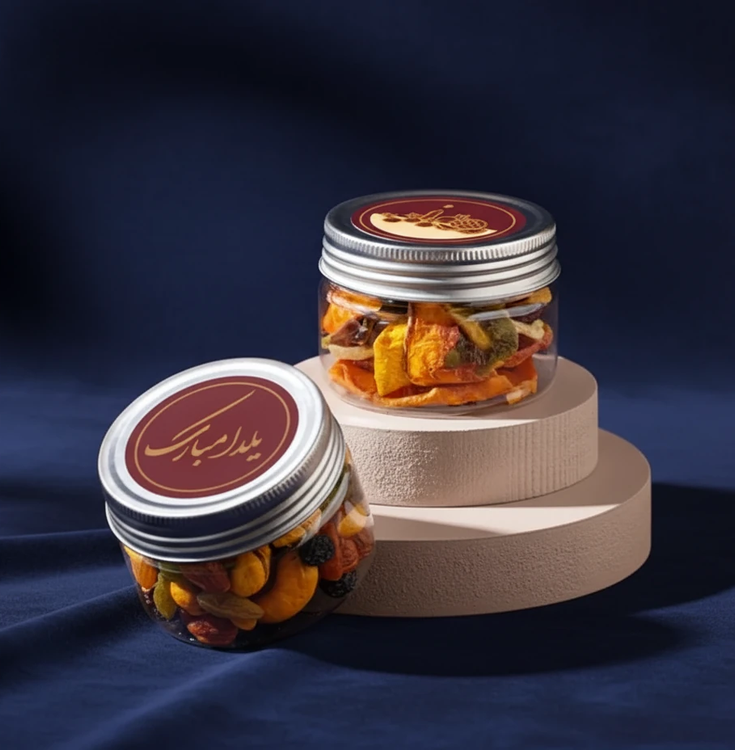 جزییات: آجیل یلدایی _(۱۰۰ گرم) میوه خشک_ (۴۰ گرم) باکس هدیه