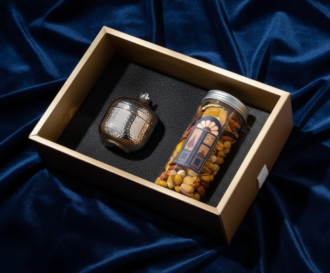 جزییات : جار بزرگ آجیل ۴ مغز  (۴۰۰ گرم) _ قندان انار کروم _ باکس لوکس