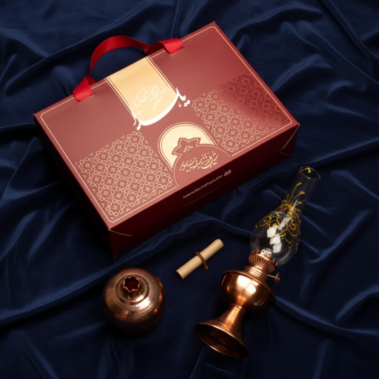 جزییات: یک عدد فال حافظ _ باکس هدیه دستهدار _ قندان انار مسی نانو شده _ چراغ گردسوز مسی